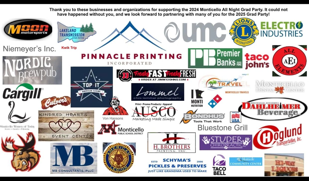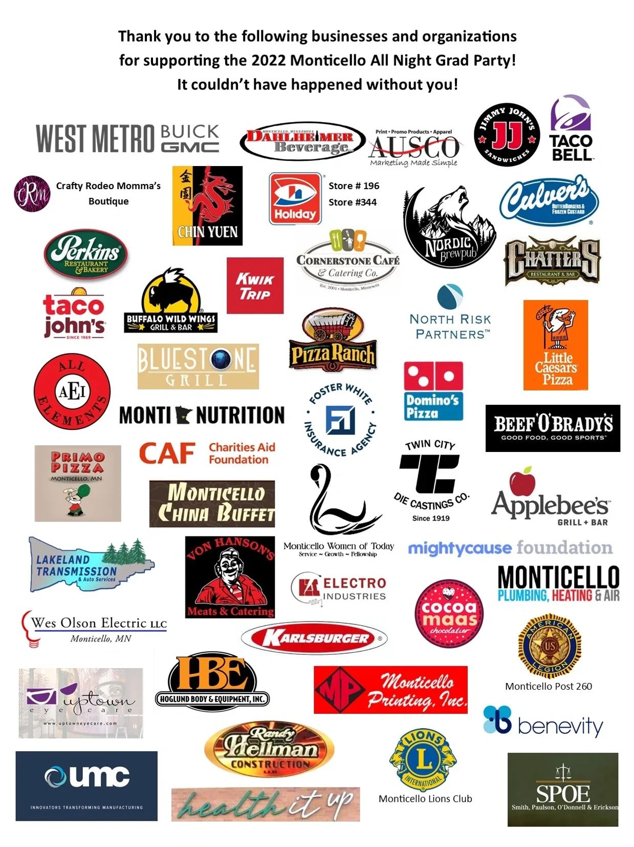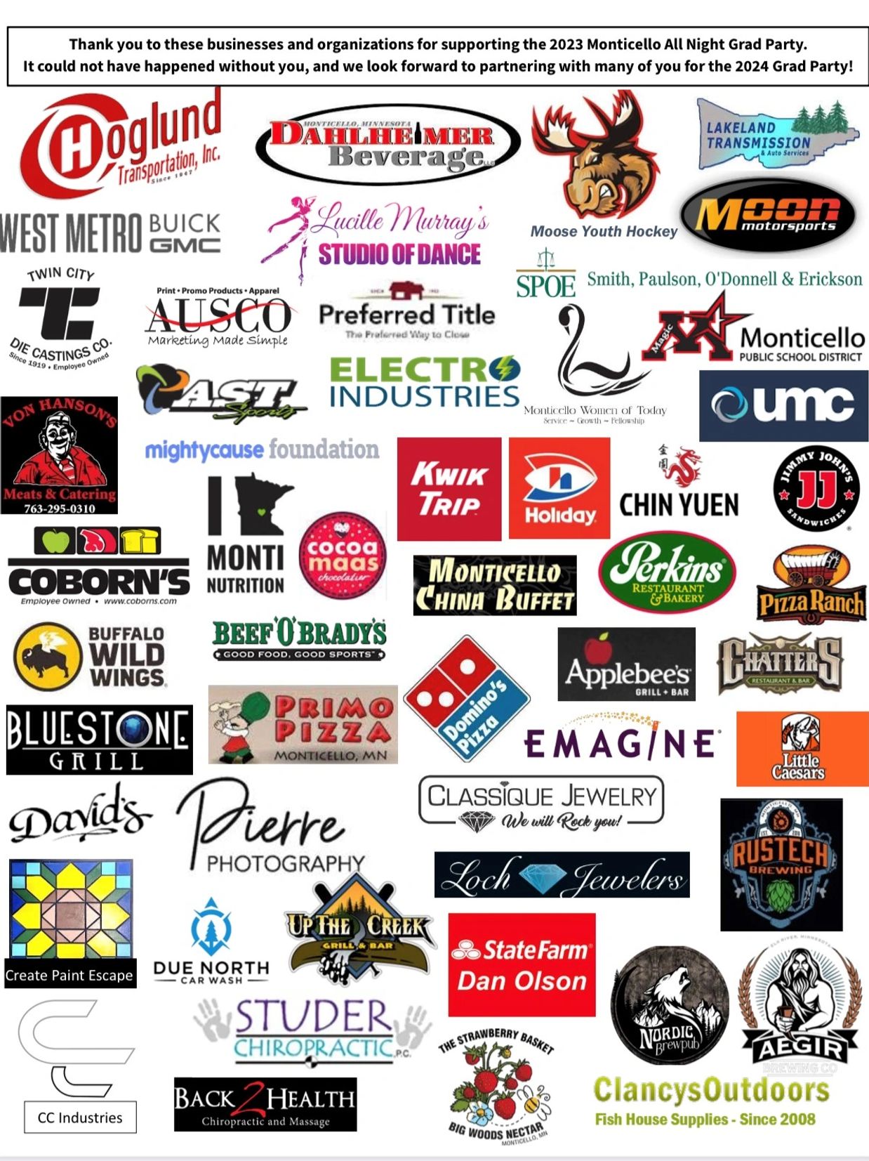 Through various types of donations, the generosity of businesses, organizations, friends, and families enables us to provide all the elements necessary for the party to succeed--decorations, entertainment, prizes, food, beverages, and a free t-shirt for the graduates. It's a night full of fun that they will never forget. We appreciate every one of you!!